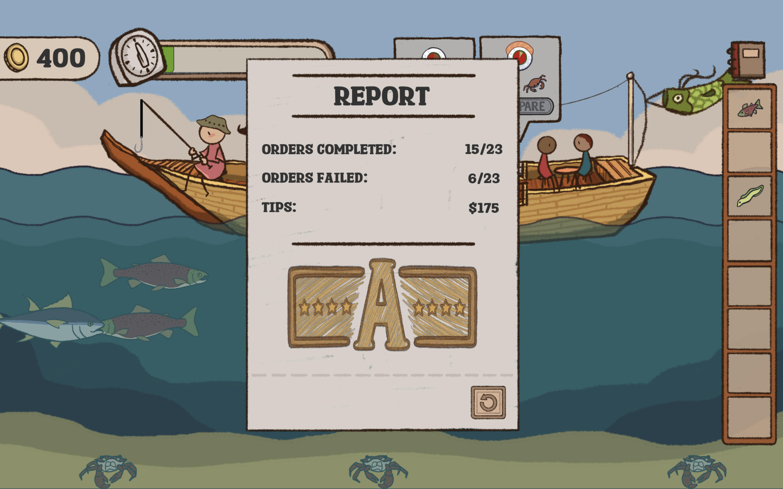Illustrated finalized game assets (e.g. player animation, customers, boat, background, logo)